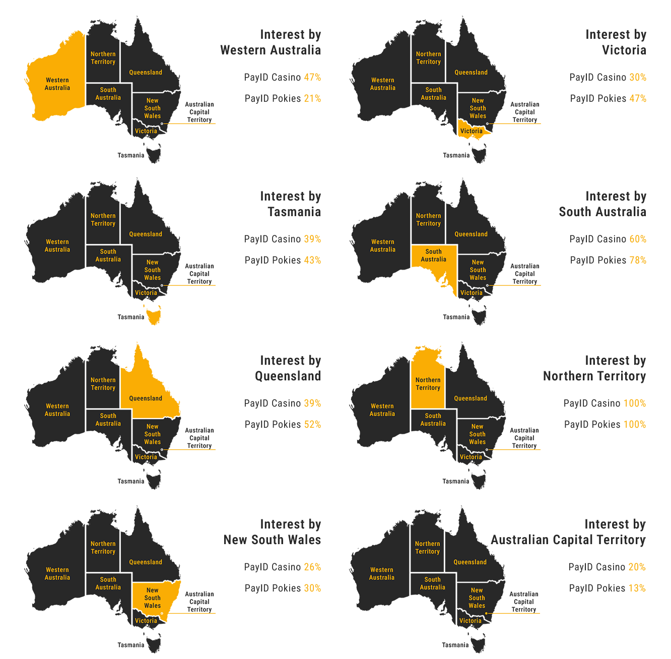 By examining the Australian states we can observe territories that showed more interest in this payment platform. For example, the residents of the Northern Territory have looked for the PayId in Google more than citizens of Queensland or Victoria. In the screenshot, we can see the indexes where the 100 point means the highest interest in the searched query and the lower number indicates the decreased interest.
